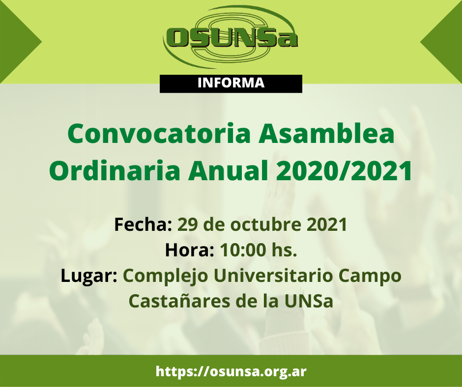 Desde OSUNSa, queremos recordarles que la Asamblea Ordinaria de AFILIADOS TITULARES se llevará a cabo el día 29 de octubre a horas 10:00, en el ANFITEATRO G400 del Complejo Universitario de Campo Castañares de la UNSa. Atendiendo a las recomendaciones sanitarias del COE UNSa y las instrucciones sanitarias definidas por las autoridades nacionales y provinciales, […]