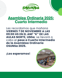 6 noviembre, 2025 Prensa 0 Comments ✅ Estimados afiliados 📌🤝 Les recordamos que mañana VIERNES 7 DE NOVIEMBRE A LAS 09:00 HS EN EL ANF “K” DE LAS AULAS NORTE, UNSa; se llevará a cabo el pase a Cuarto Intermedio de la Asamblea Ordinaria OSUNSa 2025. 🙌🏼 ¡Los esperamos!