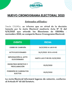 12 noviembre, 2025 Prensa 0 Comments 🗳️ Estimados afiliados. Desde OSUNSa se informa que, en virtud de la decisión tomada por la Junta Electoral mediante el Acta N° 12 del 11/11/2025, que atiende las Elecciones de OSUNSa – noviembre 2025, se comparte Nuevo Cronograma Electoral.