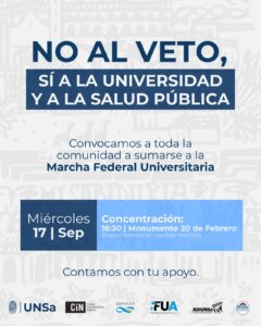 ✅ La OSUNSa adhiere a la Marcha Federal Universitaria, convocada por la UNSa, a llevarse a cabo el miércoles 17/09 en el Monumento 20 de Febrero, en defensa de la Universidad Pública y el financiamiento del sistema universitario nacional.