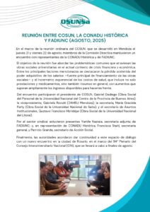 Les informamos que, el jueves 21 de agosto de 2025, la COSUN (Consejo de Obras Sociales de Universidades) mantuvo una reunión con la CONADU HISTÓRICA y con FADIUNC; para expresar y ratificar el compromiso en defensa de la obras sociales universitarias, ante la grave crisis financiera y económica que atraviesan las mismas.