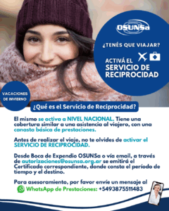 10 julio, 2025 Prensa 0 Comments Estimados afiliados: Si tienen previsto realizar un viaje, deben activar el Servicio de Reciprocidad de OSUNSa. Para consultas, pueden dirigirse al WhatsApp de Prestaciones 03875511483.